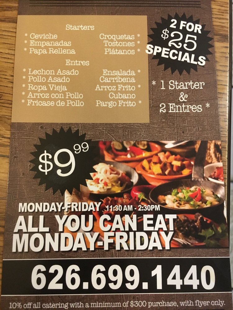 Media Noche Cuban Cuisine is a vibrant buffet offering authentic Cuban and seafood dishes in Covina, CA. With a Latinx-owned establishment, the restaurant provides a casual dining experience with options for outdoor seating and waiter service. The menu showcases Cuban classics like Ropa Vieja, Carne con Papas, and Pollo Encebollado, each prepared with fresh ingredients and traditional recipes. Customers rave about the flavorful dishes, with Alma C. praising the Tostones mofongo, and Its Yo Boy M. describing the Cubano sandwich as a must-try. The warm ambiance and attentive staff create a welcoming atmosphere for diners to enjoy a culinary journey through Cuba. Be sure to save room for desserts like flan and tres leches cake to cap off your delightful meal at Media Noche Cuban Cuisine.